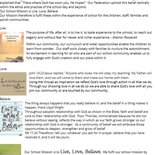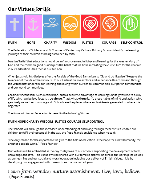The Mission of our school lived out through the Virtues of the Federation underpin our teaching and learning, and provide an environment which prepares our pupils as confident, happy citizens.
